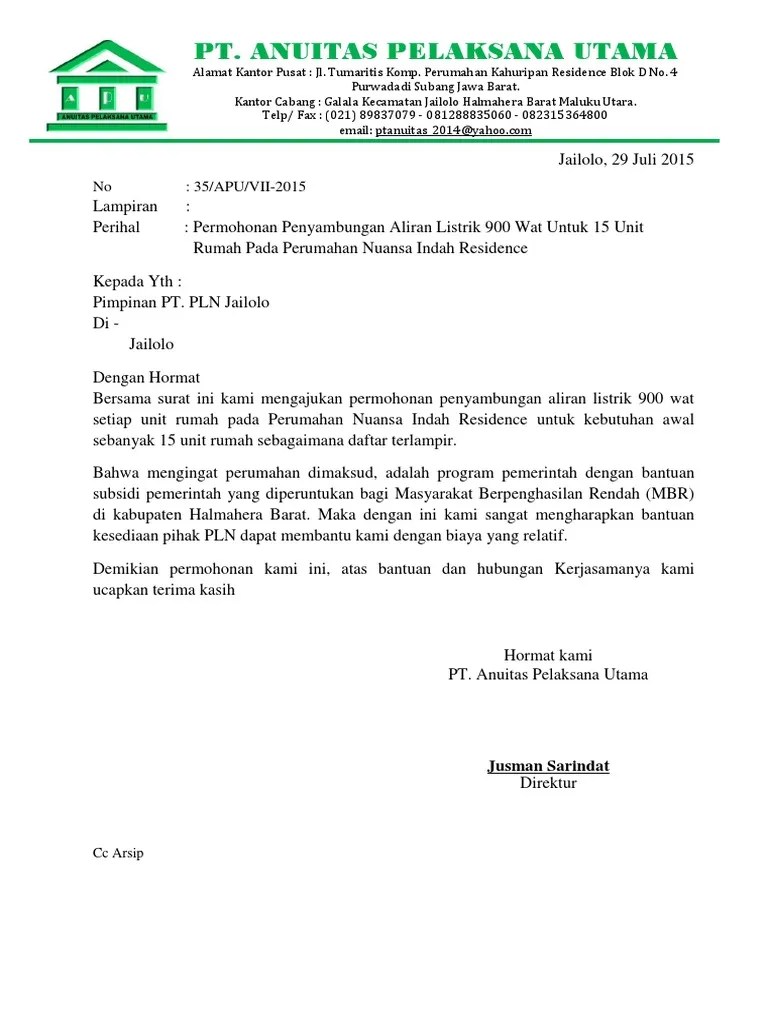 Contoh surat permohonan pemasangan listrik pln pasang baru nomor.